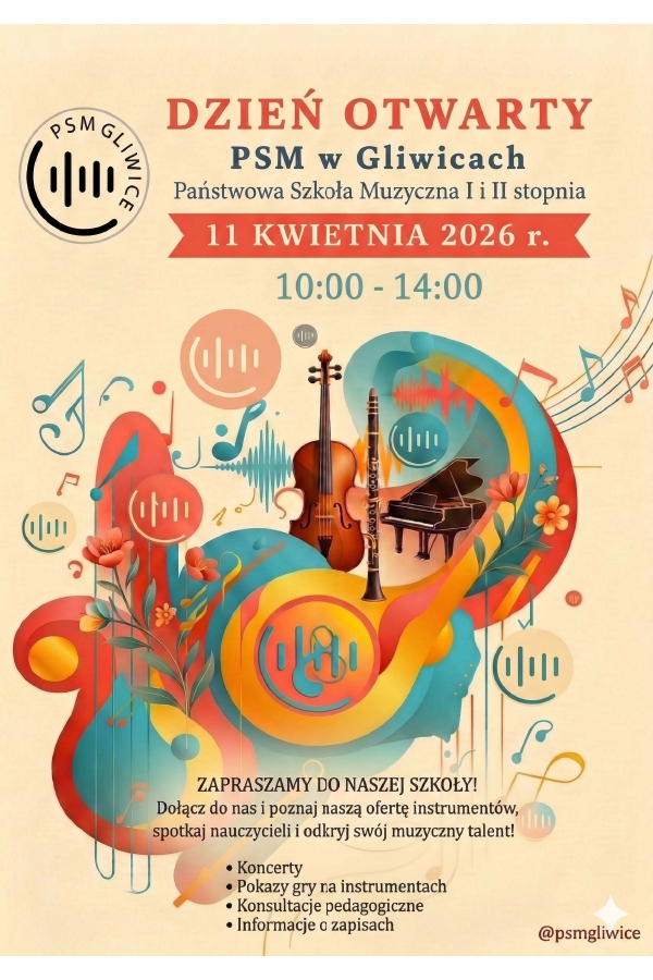 Home Aktualności Dzień Otwarty Państwowej Szkoły Muzycznej I i II stopnia w Gliwicach Dzień Otwarty Państwowej Szkoły Muzycznej I i II stopnia w Gliwicach 8 kwietnia 2026 Państwowa Szkoła Muzyczna I i II stopnia w Gliwicach zaprasza na Dzień Otwarty, który odbędzie się 11 kwietnia 2026 roku w godzinach od 10:00 do 14:00. To doskonała okazja, aby poznać szkołę, jej ofertę edukacyjną oraz nauczycieli, a także dowiedzieć się więcej o możliwościach rozwoju muzycznego dla dzieci i młodzieży. Co przygotowaliśmy? W programie Dnia Otwartego przewidziano: koncerty, pokazy gry na instrumentach, konsultacje pedagogiczne, informacje dotyczące rekrutacji i zapisów. Dlaczego warto nas odwiedzić? Zapraszamy wszystkich zainteresowanych nauką muzyki do odwiedzenia szkoły. Podczas wydarzenia będzie można: zapoznać się z ofertą instrumentów, spotkać nauczycieli, poznać zasady nauki w szkole muzycznej, odkryć swój muzyczny talent. Termin i miejsce Data: 11 kwietnia 2026 r.Godzina: 10:00–14:00Miejsce: Państwowa Szkoła Muzyczna I i II stopnia w Gliwicach Share Tweet Drukuj Wsparcie dla organizacji Baza NGO Lokale - Rezerwacja Oferta dla szkół Oferty wolontariatu Strefa Seniora Do pobrania Wydarzenia Kontakt Podobne artykuły Spotkanie podróżnicze w ramach GBO 26 października 2023 Otwarty Konkurs - wspieranie i upowszechnianie kultury fizycznej 10 października 2019 Wolontariat w Stow. Rodzin Zastępczych „Pod Skrzydłami” 30 stycznia 2018 Spotkanie regionalne RPO 11 października 2017 Bezpłatne warsztaty „Odkrywca talentów” 6 października 2023 SZKOLENIE „Przeciwdziałanie praniu brudnych pieniędzy i finansowania terroryzmu” 30 listopada 2017 Zobacz wszystkie artykuły Kategorie Wernisaż wystawa Wydarzenia Dla najmłodszych Dla mieszkańców Dla seniorów Dla NGO Dla młodzieży Dotacje Kultura Szkolenia Wolontariat Praca Strona internetowa Centrum 3.0 - Gliwickiego Ośrodka Działań Społecznych, wykorzystuje pliki cookies (tzw. ciasteczka). Pliki te są zapisywane w pamięci urządzeń elektronicznych, za pomocą których, strona jest przeglądana. Pliki te są wykorzystywane przez administratora w celach statystycznych. Więcej informacji w polityce cookies. Zamknij