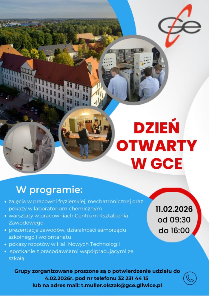 Home Aktualności Dzień Otwarty w GCE Dzień Otwarty w GCE 10 lutego 2026 Zapraszamy na Dzień Otwarty w Górnośląskim Centrum Edukacyjnym, który odbędzie się 11 lutego 2026 roku w godzinach 9:30–16:00. To doskonała okazja, aby poznać ofertę edukacyjną szkoły, zobaczyć pracownie i laboratoria oraz porozmawiać z uczniami, nauczycielami i partnerami szkoły. W programie: zajęcia w pracowni fryzjerskiej i mechatronicznej pokazy w laboratorium chemicznym warsztaty w pracowniach Centrum Kształcenia Zawodowego prezentacja zawodów oraz działalności samorządu szkolnego i wolontariatu pokazy robotów w Hali Nowych Technologii spotkania z pracodawcami współpracującymi ze szkołą Informacje organizacyjne Grupy zorganizowane proszone są o potwierdzenie udziału do 4 lutego 2026 r. Kontakt:telefon: 32 231 44 15 e-mail: t.muller.olszak@gce.gliwice.pl Share Tweet Drukuj Wsparcie dla organizacji Baza NGO Lokale - Rezerwacja Oferta dla szkół Oferty wolontariatu Strefa Seniora Do pobrania Wydarzenia Kontakt Podobne artykuły Zgłoś kandydatów na członków komisji konkursowych 11 grudnia 2019 Spotkanie: „Nowe wzory dokumentacji związanej z realizacją zadań publicznych” 2 października 2019 Nordic Walking - przez Gliwice! 2 czerwca 2021 Praca - starszy specjalista 14 września 2022 Warsztaty WFOŚiGW w Katowicach – edukacja ekologiczna i ochrona przyrody 3 listopada 2025 27 lutego świętujemy ludzi z wielkim sercem! 27 lutego 2026 Zobacz wszystkie artykuły Kategorie Wernisaż wystawa Wydarzenia Dla najmłodszych Dla mieszkańców Dla seniorów Dla NGO Dla młodzieży Dotacje Kultura Szkolenia Wolontariat Praca Strona internetowa Centrum 3.0 - Gliwickiego Ośrodka Działań Społecznych, wykorzystuje pliki cookies (tzw. ciasteczka). Pliki te są zapisywane w pamięci urządzeń elektronicznych, za pomocą których, strona jest przeglądana. Pliki te są wykorzystywane przez administratora w celach statystycznych. Więcej informacji w polityce cookies. Zamknij