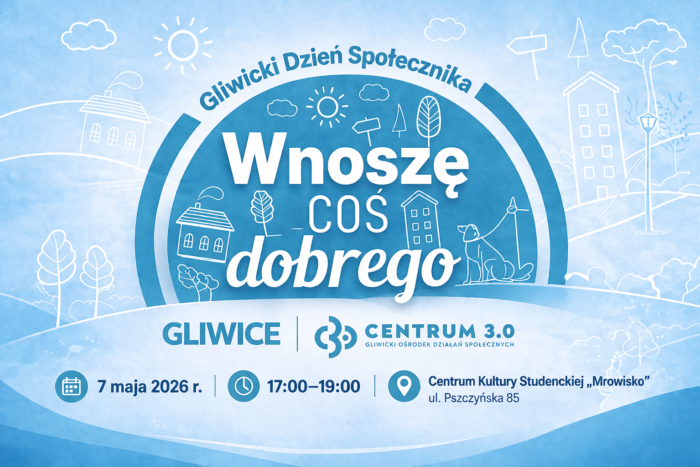Home Aktualności GLIWICKI DZIEŃ SPOŁECZNIKA 7.05.2026 GLIWICKI DZIEŃ SPOŁECZNIKA 7.05.2026 15 kwietnia 2026 Społeczna energia Gliwic w jednym miejscu. Przed nami Gliwicki Dzień Społecznika Już 7 maja 2026 roku w Gliwicach odbędzie się spotkanie osób, które aktywnie działają na rzecz swojego otoczenia i nie pozostają obojętne na potrzeby innych.. Gliwicki Dzień Społecznika będzie okazją, aby uhonorować mieszkańców angażujących się w wolontariat, działalność organizacji pozarządowych, pracę w radach dzielnic oraz w realizację lokalnych inicjatyw. To właśnie dzięki ich pracy i zaangażowaniu w Gliwicach powstają wartościowe inicjatywy społeczne, a lokalna wspólnota staje się silniejsza i bardziej zintegrowana. Wydarzenie to będzie stanowić również przestrzeń do wspólnego świętowania, integracji oraz nawiązywania nowych relacji i współpracy. Nowa formuła spotkania społecznikówGliwicki Dzień Społecznika zastąpi dotychczasowe Forum Lokalnych Liderów Społecznych. Zmiana ta wynika z rozmów prowadzonych ze środowiskiem społeczników oraz zgłaszanych przez nie potrzeb – między innymi podczas prac nad strategią marki miasta. Nowa formuła będzie bardziej otwarta i nastawiona na integrację. Organizatorom zależy przede wszystkim na stworzeniu przestrzeni do bezpośrednich rozmów, wymiany doświadczeń oraz nawiązywania współpracy pomiędzy osobami, które łączy zaangażowanie w sprawy lokalne. Wydarzenie jest organizowane po raz pierwszy, trochę jako „rozgrzewka” przed przyszłorocznym Dniem Społecznika, który docelowo mógłby być organizowany bliżej daty Światowego Dnia NGO, tj. 27 lutego. Podczas tej pierwszej edycji Gliwickiego Dnia Społecznika będziemy pytać uczestników spotkania o to, jak powinno to wydarzenie wyglądać w kolejnych latach, jaka formuła byłabym im najbliższa – mówi Marta Kryś/Katarzyna KKB? Jesteśmy otwarci na wszystkie sugestie, w końcu ma to być święto społeczników. Najważniejsze informacje Data: 7 maja 2026 r. (czwartek)Godzina: 17:00–19:00Miejsce: Centrum Kultury Studenckiej „Mrowisko”, ul. Pszczyńska 85 w Gliwicach Program wydarzeniaSpotkanie rozpocznie się powitaniem uczestników oraz wystąpieniem przedstawicieli władz Miasta. Następnie odbędzie się prelekcja pochodzącego z Knurowa Macieja Makselona dotycząca dobrej komunikacji i roli języka w działalności społecznej. Gość wydarzenia to trener i praktyk pracy z tekstem, prowadzący autorskie warsztaty z redakcji, kreatywnego pisania oraz komunikacji, który występował m.in. na uczelniach w całej Polsce, konferencjach naukowych i wydarzeniach takich jak targi książki czy Open’er Festival. Prowadził także szkolenia z języka inkluzywnego dla instytucji międzynarodowych, w tym Komisji Europejskiej w Luksemburgu. Jest prelegentem wystąpień TEDx, współprowadzi program „Dobry tytuł” w TVP Kultura oraz regularnie zabiera głos w mediach na temat języka i literatury. Muzycznym akcentem wydarzenia będzie koncert uczniów Państwowej Szkoły Muzycznej w Gliwicach. Na zakończenie zaplanowano część integracyjną – czas na rozmowy, wymianę kontaktów oraz poczęstunek dla uczestników. Rejestracja Zapisy: poprzez platformę Decydujmy Razem (tutaj)Termin zgłoszeń: do 23 kwietnia 2026 r. Miasto tworzą ludzieGliwicki Dzień Społecznika ma przypominać, że miasto to przede wszystkim ludzie, którzy chcą działać i brać odpowiedzialność za swoje otoczenie. Spotkanie ma być nie tylko podsumowaniem dotychczasowych działań, ale także impulsem do kolejnych inicjatyw i dalszej współpracy na rzecz Gliwic. To także szansa na nowe pomysły, nowe kontakty i kolejne działania, które będą realnie wpływać na życie mieszkańców miasta. Zapraszamy do wspólnego świętowania! Share Tweet Drukuj Wsparcie dla organizacji Baza NGO Lokale - Rezerwacja Oferta dla szkół Oferty wolontariatu Strefa Seniora Do pobrania Wydarzenia Kontakt Podobne artykuły Rozpoczęliśmy pracę nad Programem Współpracy Miasta Gliwice z Organizacjami Pozarządowymi na rok 2021 22 czerwca 2020 Lokal w Bytomiu zaprasza na spotkanie! 24 listopada 2021 I regionalne zawody w gimnastyce artystycznej KIDS CHALLENGE. 26 maja 2017 Ogłoszenie otwartego konkursu ofert 24 sierpnia 2021 Gliwickie Obchody Dnia Wolontariusza 2025 7 listopada 2025 Medialna Mozaika - warsztaty dla młodzieży (17.01) 1 stycznia 2018 Zobacz wszystkie artykuły Kategorie Wernisaż wystawa Wydarzenia Dla najmłodszych Dla mieszkańców Dla seniorów Dla NGO Dla młodzieży Dotacje Kultura Szkolenia Wolontariat Praca Strona internetowa Centrum 3.0 - Gliwickiego Ośrodka Działań Społecznych, wykorzystuje pliki cookies (tzw. ciasteczka). Pliki te są zapisywane w pamięci urządzeń elektronicznych, za pomocą których, strona jest przeglądana. Pliki te są wykorzystywane przez administratora w celach statystycznych. Więcej informacji w polityce cookies. Zamknij